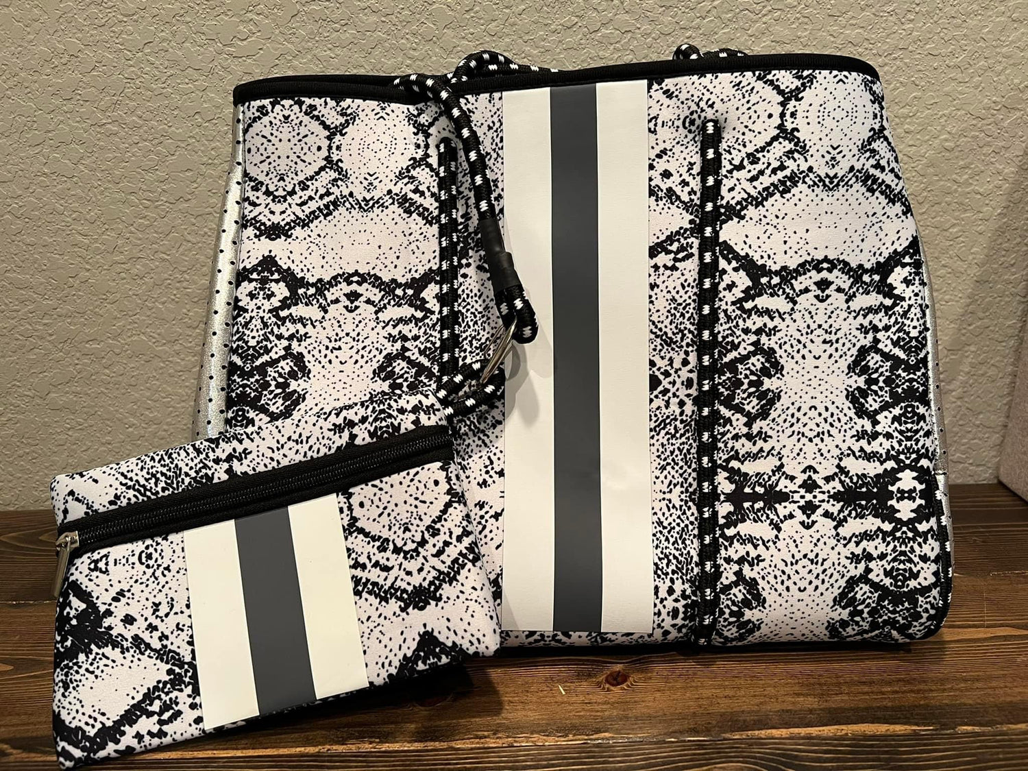 Large neoprene tote with black silver and white snake skin print also come with wristlet. Snaps on side to make smaller.